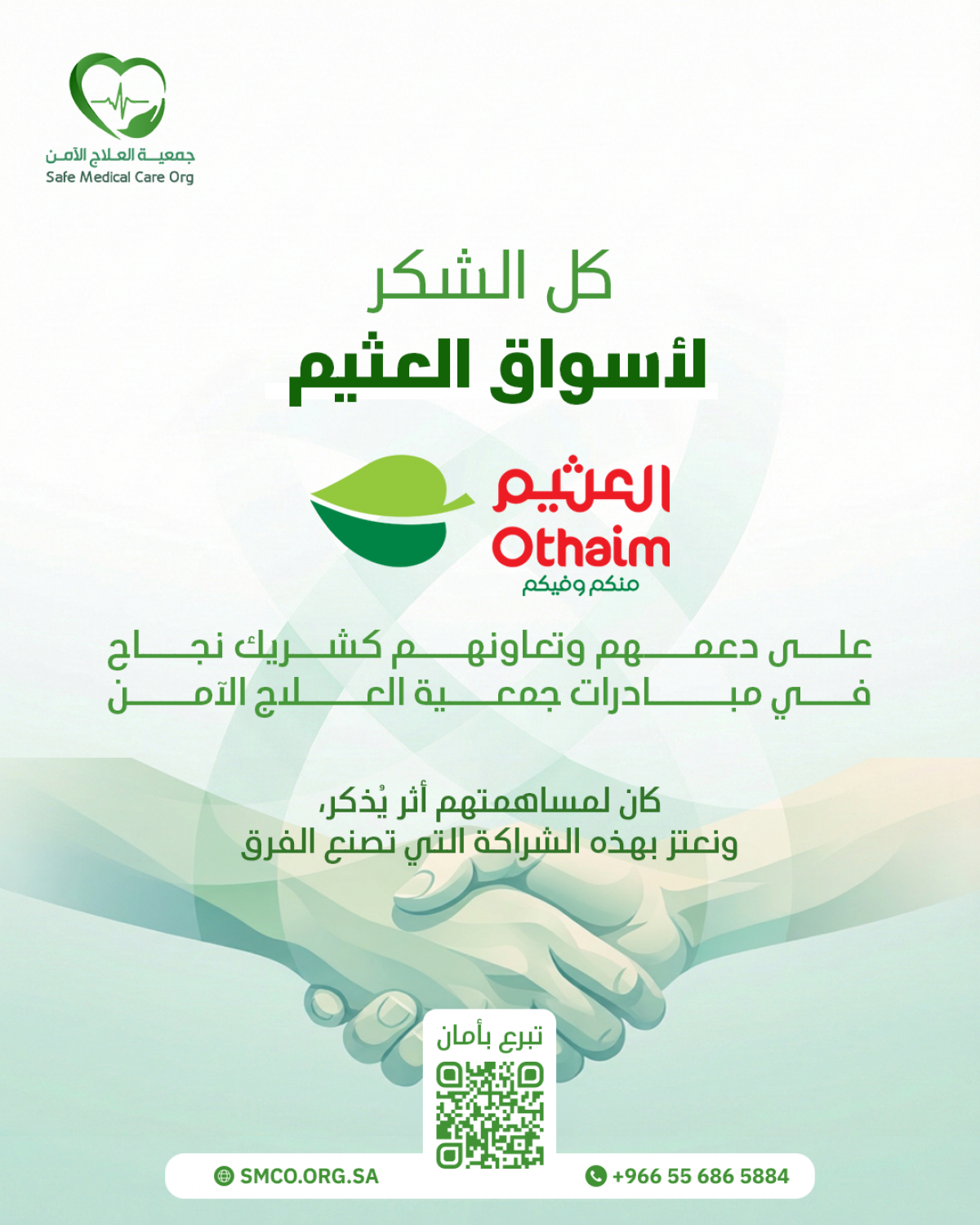 تتقدم جمعية العلاج الآمن بمحافظة جدة بخالص الشكر والتقدير إلى أسواق العثيم على دعمهم وتعاونهم كشريك نجاح في مبادرات وبرامج الجمعية.
